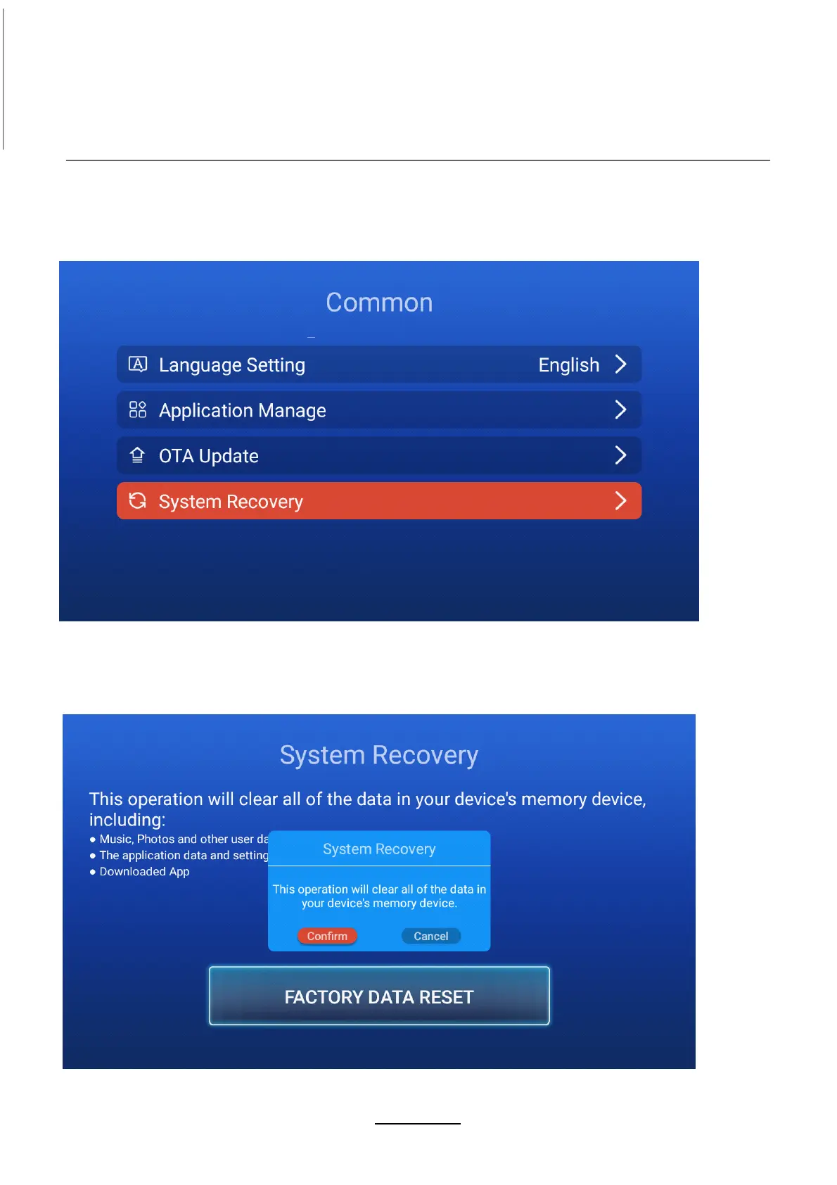 Click the “FACTORY DATA RESET” button to do system Recovery, and all apps you have