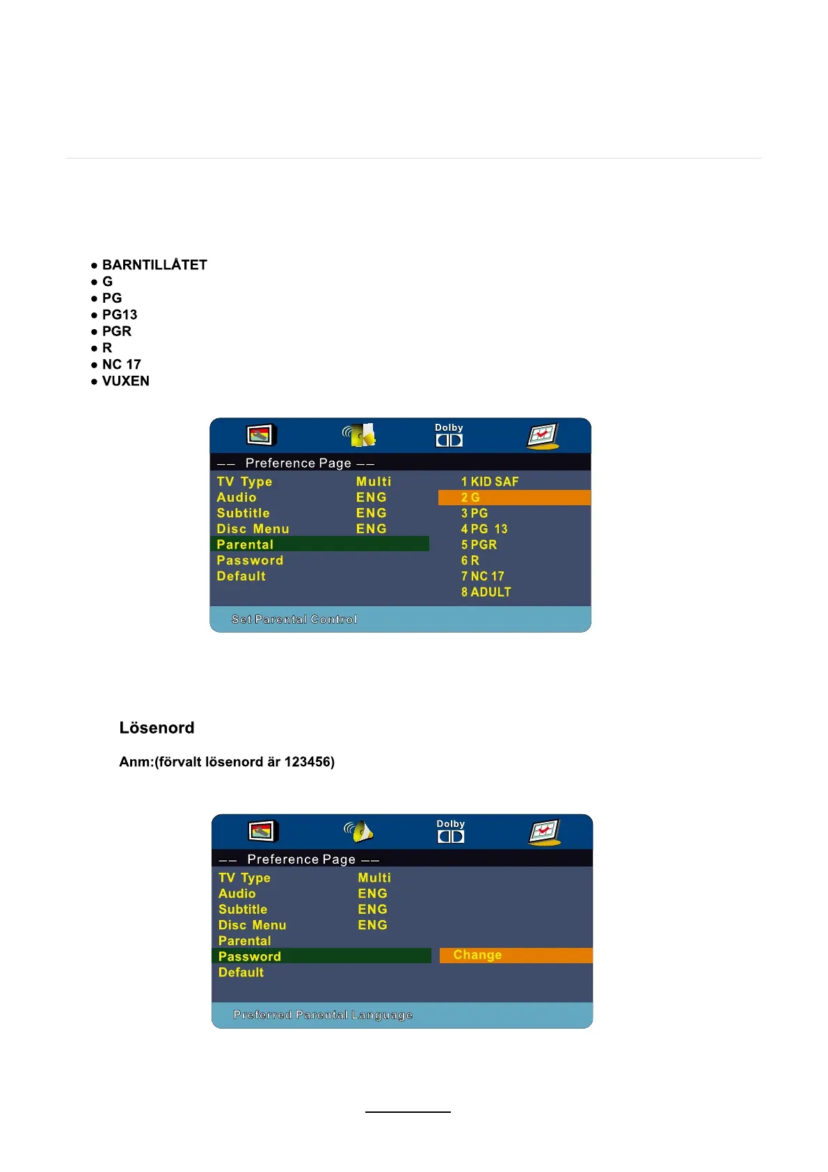 önskemål. Om du t ex väljer PG kommer videoskivor med högre klassning än PG inte att kunna spelas.