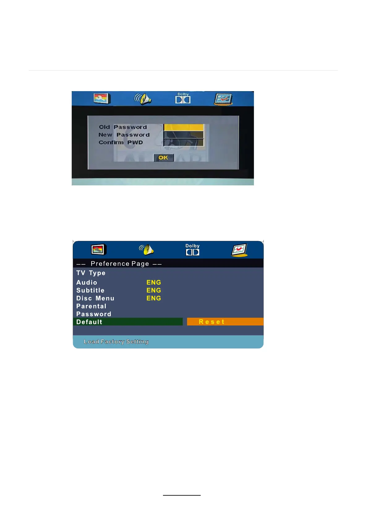 Du kan själv välja att hämta fabriksinställningarna genom att välja RESET och trycka på knappen OK.