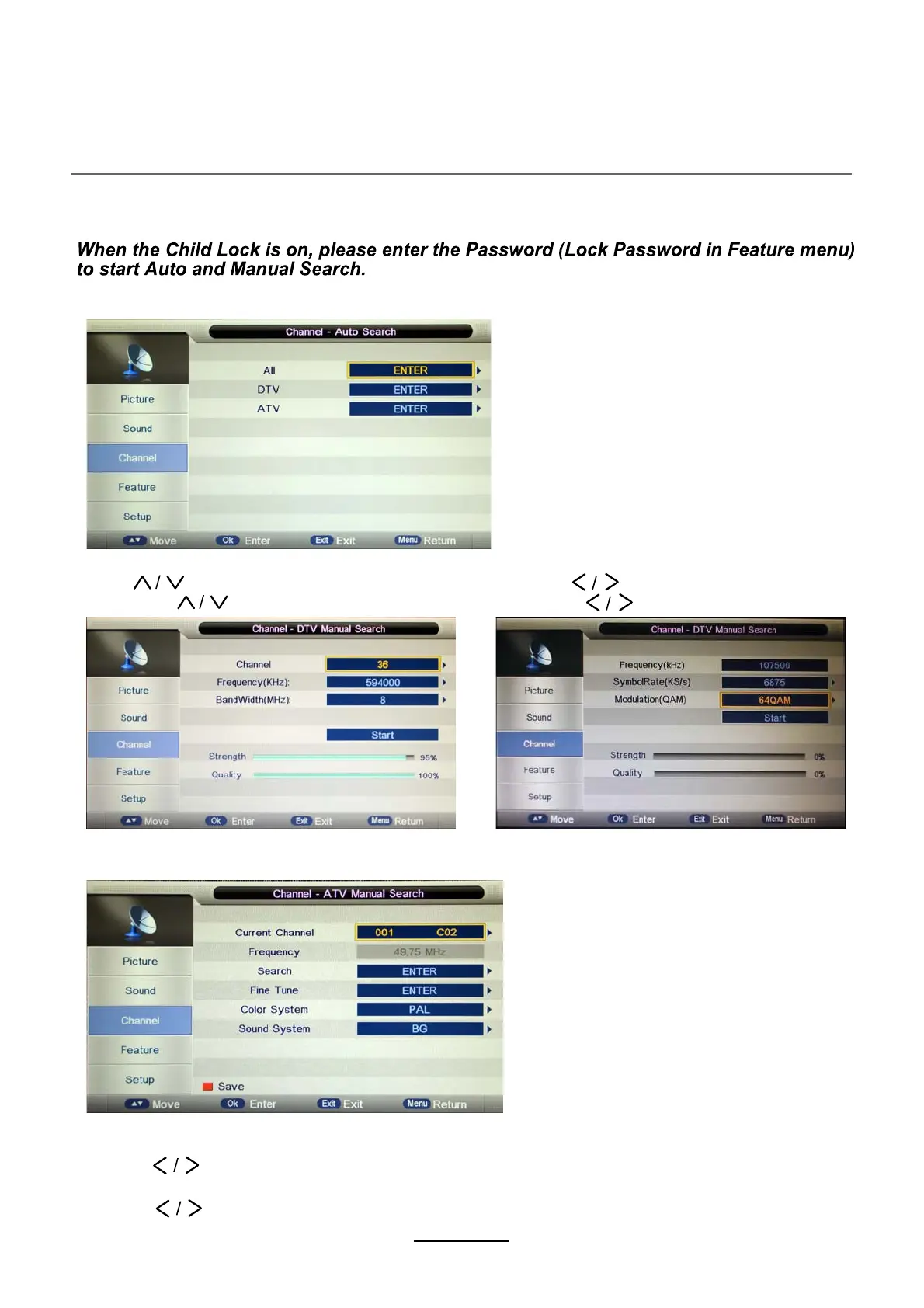 DTV Manual Search: Enter the DTV Manual Search menu.