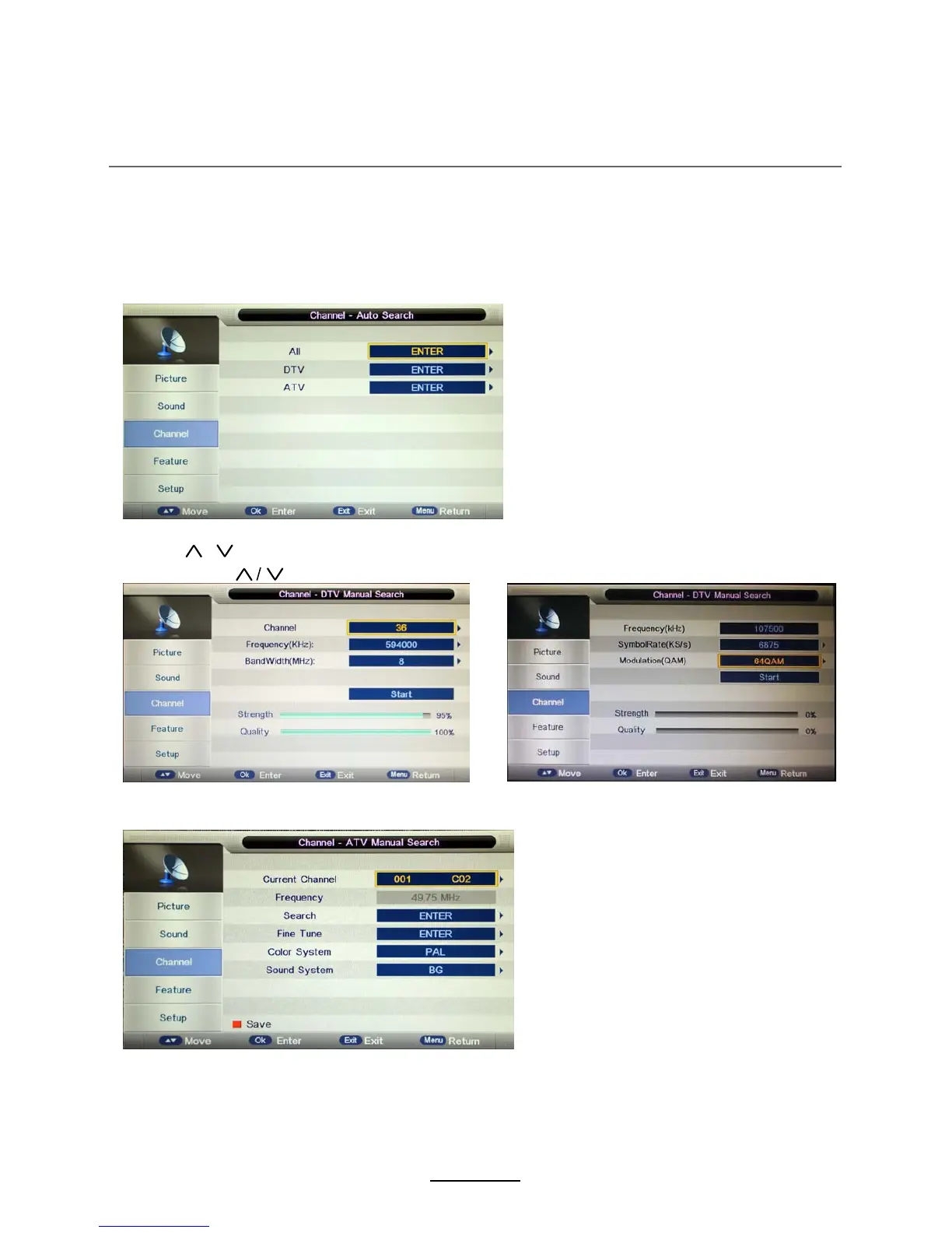 Sök: Tryck på OK-knappen för att öppna menyn Sök. Sök manuellt frekvensen