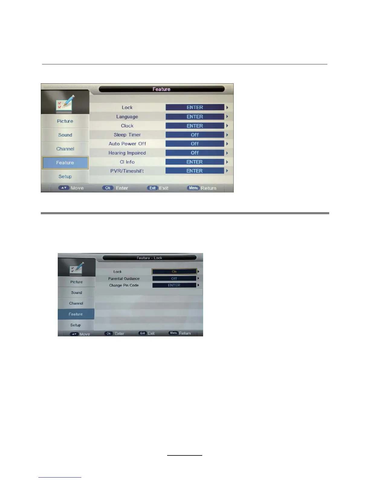 Lås: I denna meny kan du låsa vissa funktioner i TV:n så att de inte kan användas eller visas.