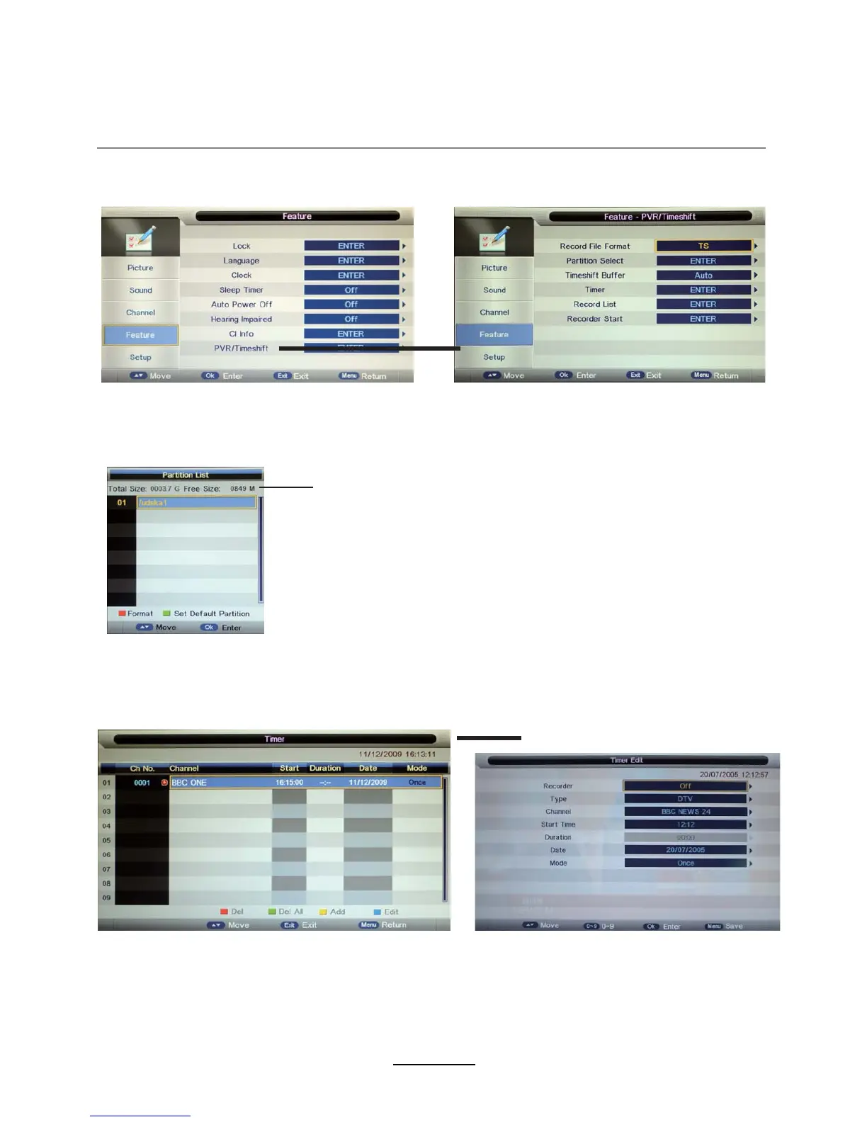 Tryck på MENU-knappen för att välja menyn Funktion-PVR/Timeshift, tryck på OK-knappen för att öppna