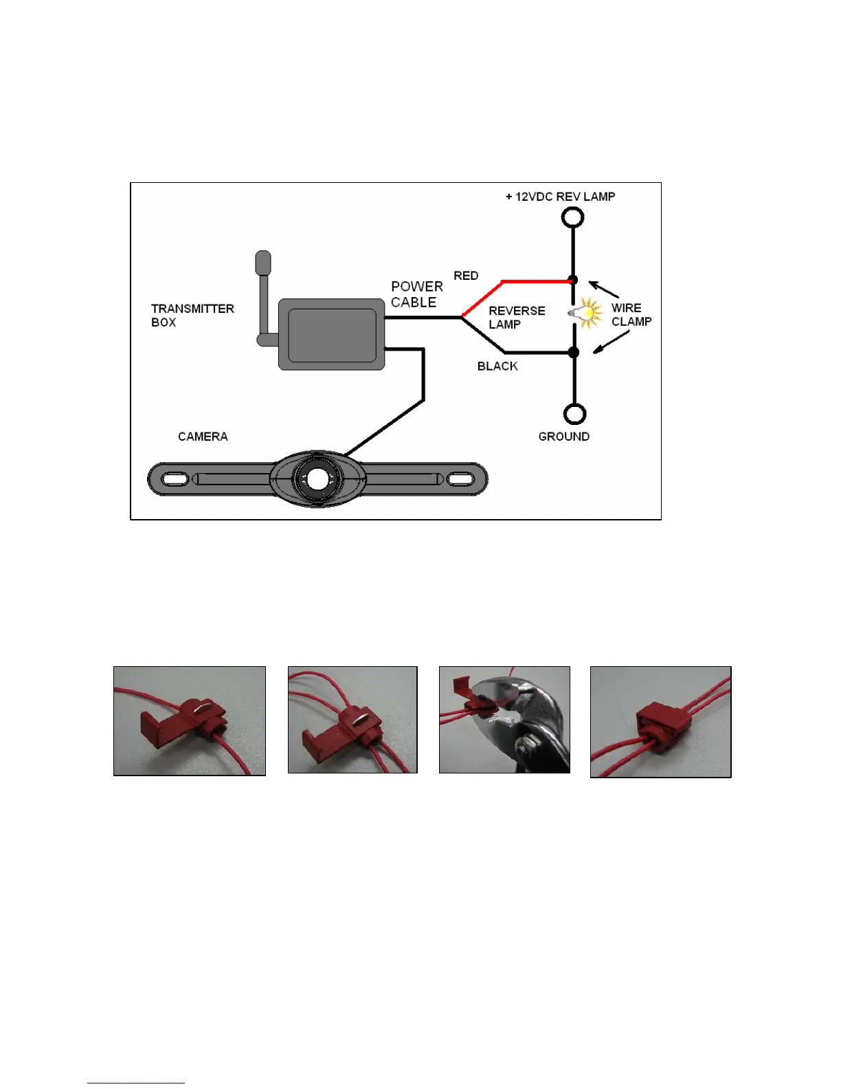 15. Splice the red wire using the supplied wire clamp to the reverse light’s positive (+) wire. Use a