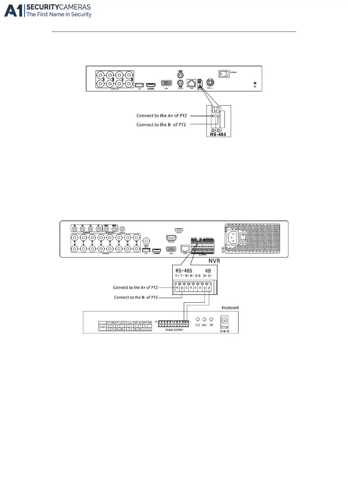 To connect PTZ to the DVR: