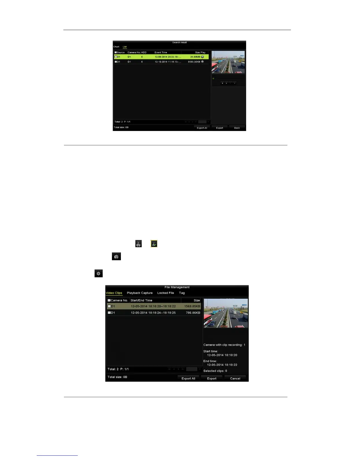 7. Export the video clips or captured pictures in playback. Please refer to step5 of Chapter 7.1.2 Backing up by