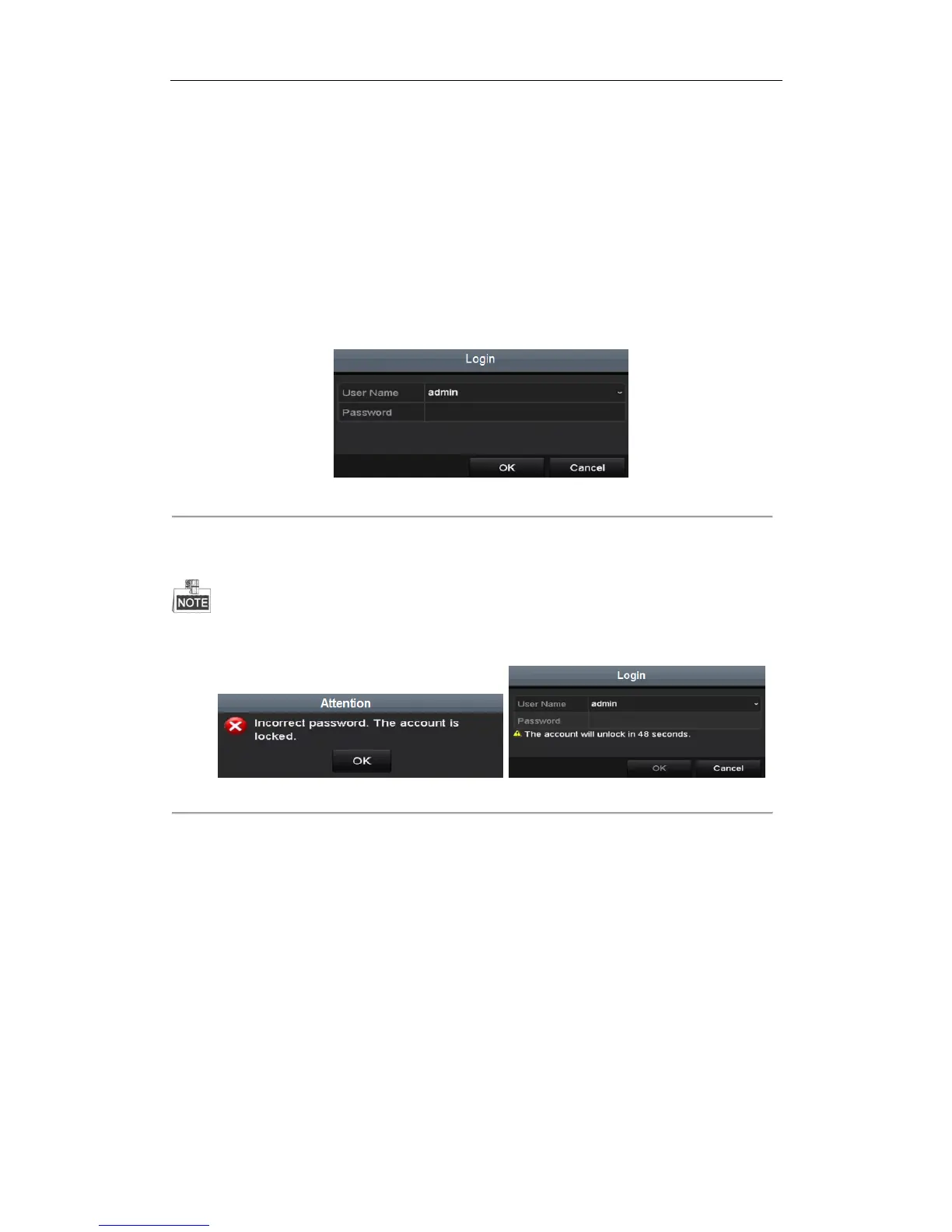 In the Login dialog box, if you enter the wrong password 7 times, the current user account will be locked for 60