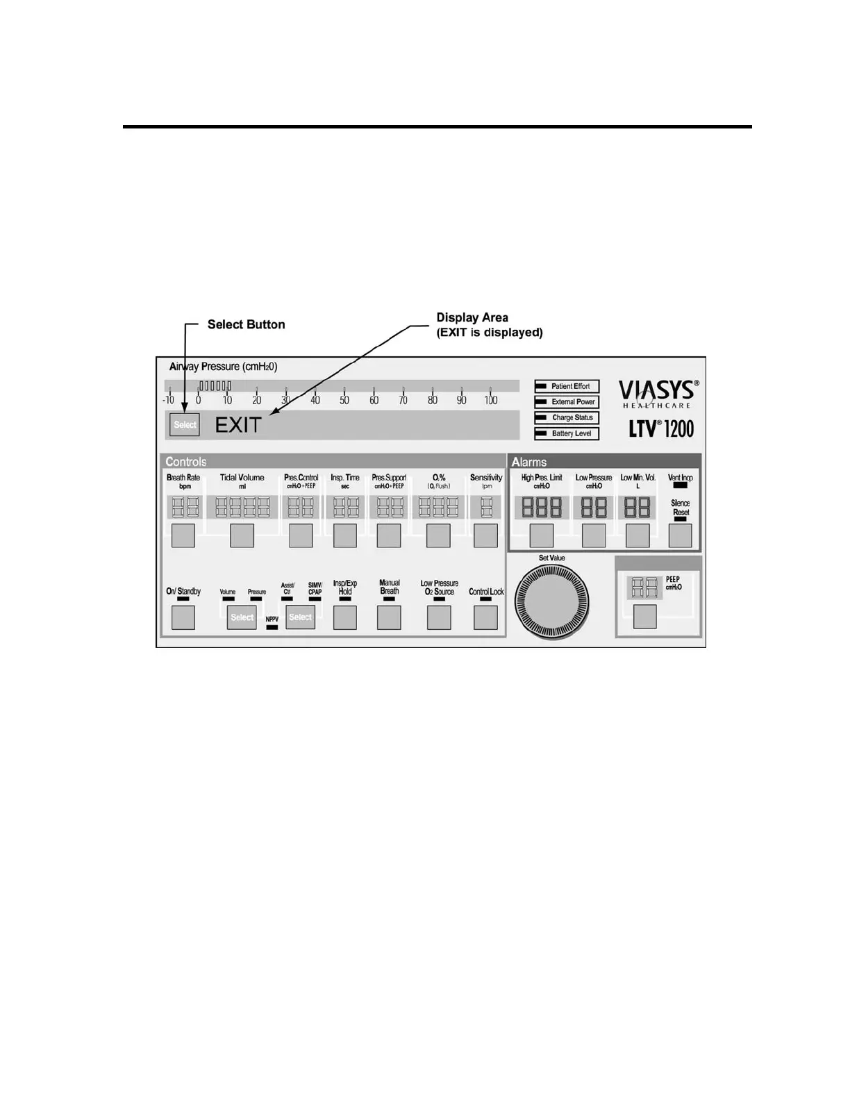 1) Turn the Set Value knob to scroll through the main menu entries (VENT OP, ALARM