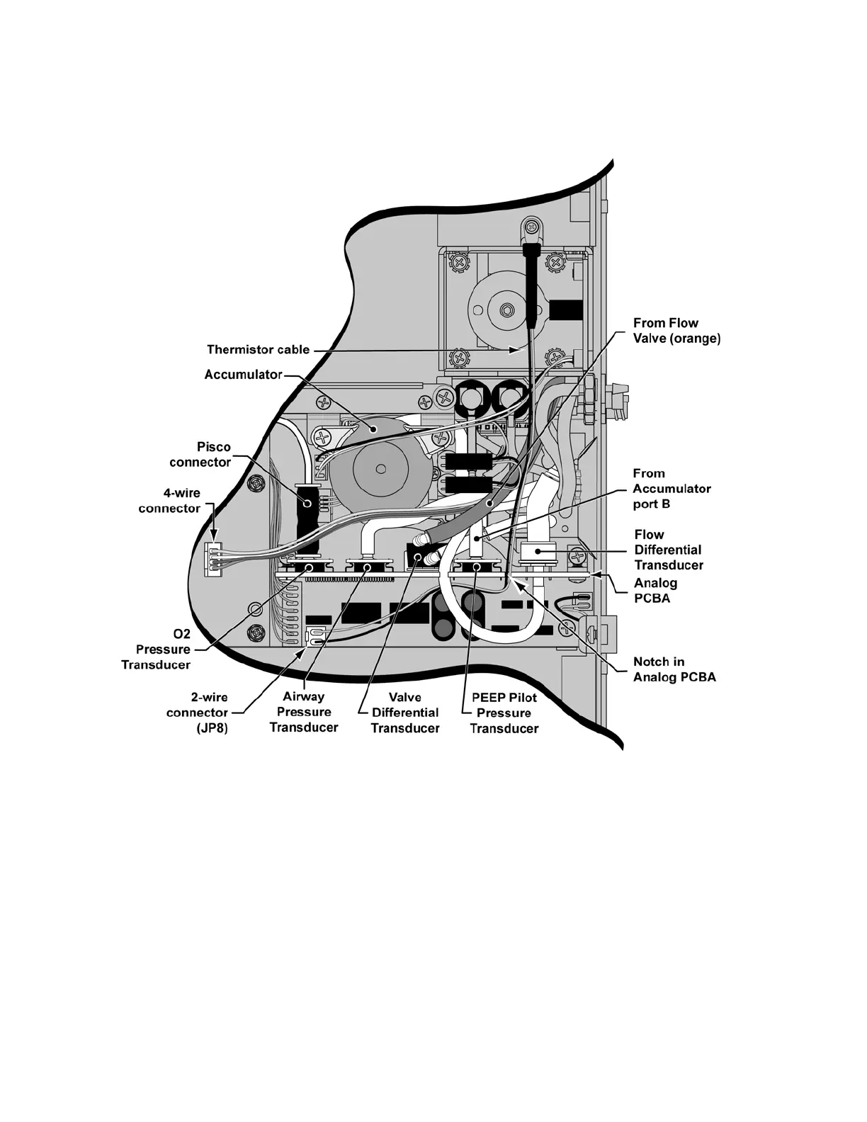 • To the valve differential transducer (low side, furthest from the board) from the flow valve