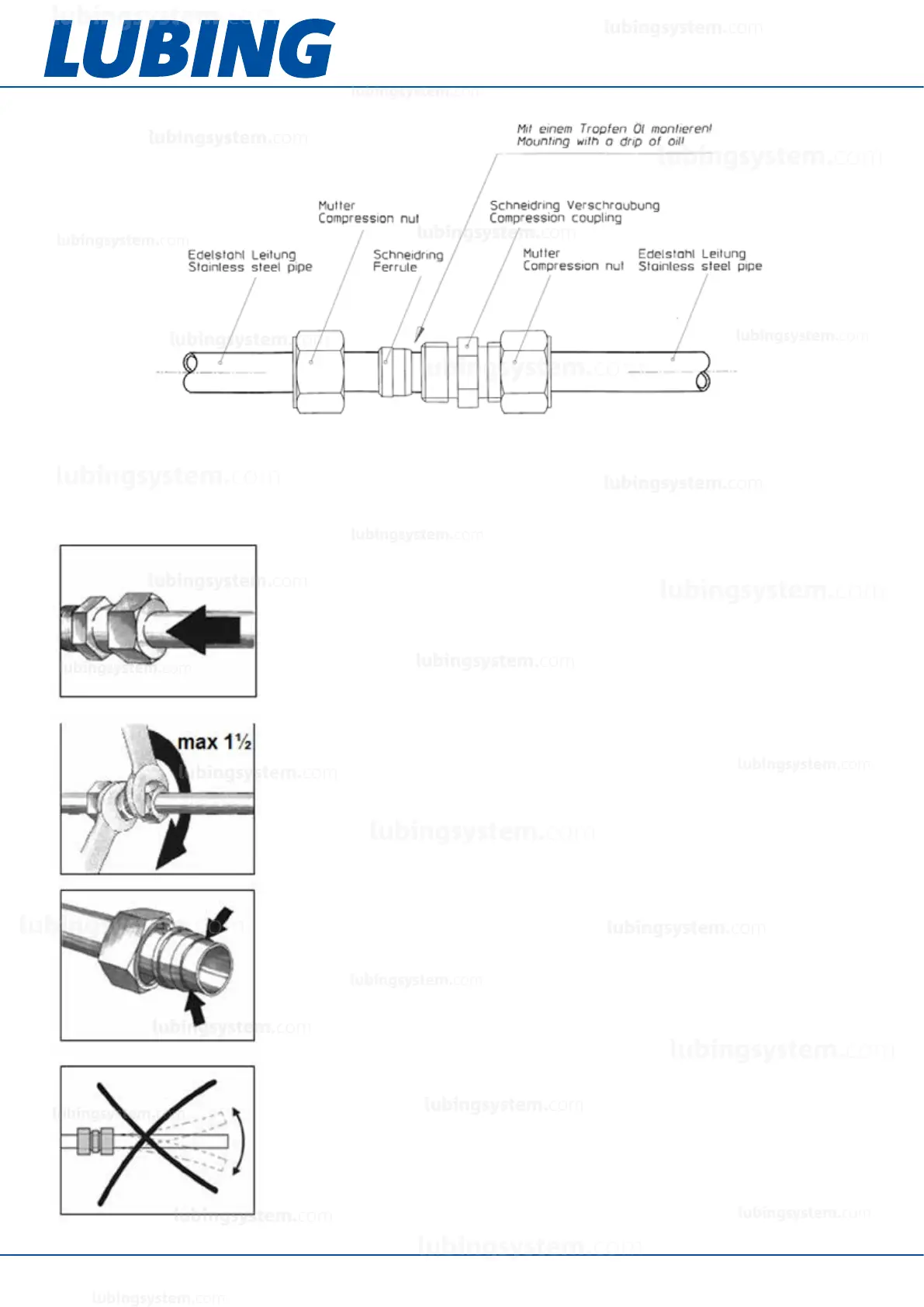 – First push the union nut onto the pipe, then the cutting ring with cutting