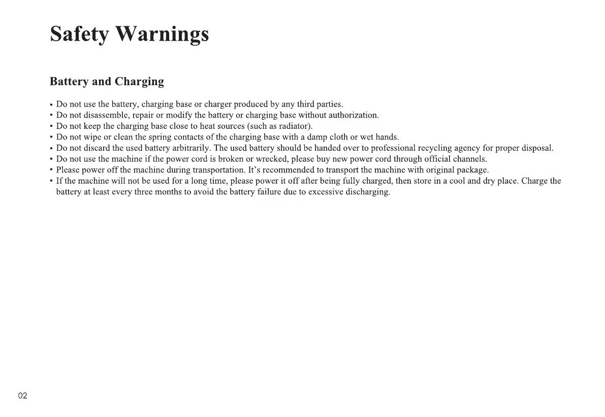 • Do not disassemble, repair or modify the battery or charging base without authorization.