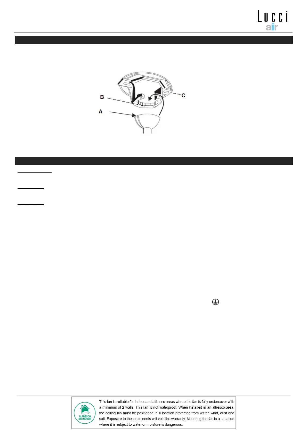in den Anschlag (B) der Halterung (C) greifen, um ein Verdrehen des Ventilators im Betrieb zu verhindern.