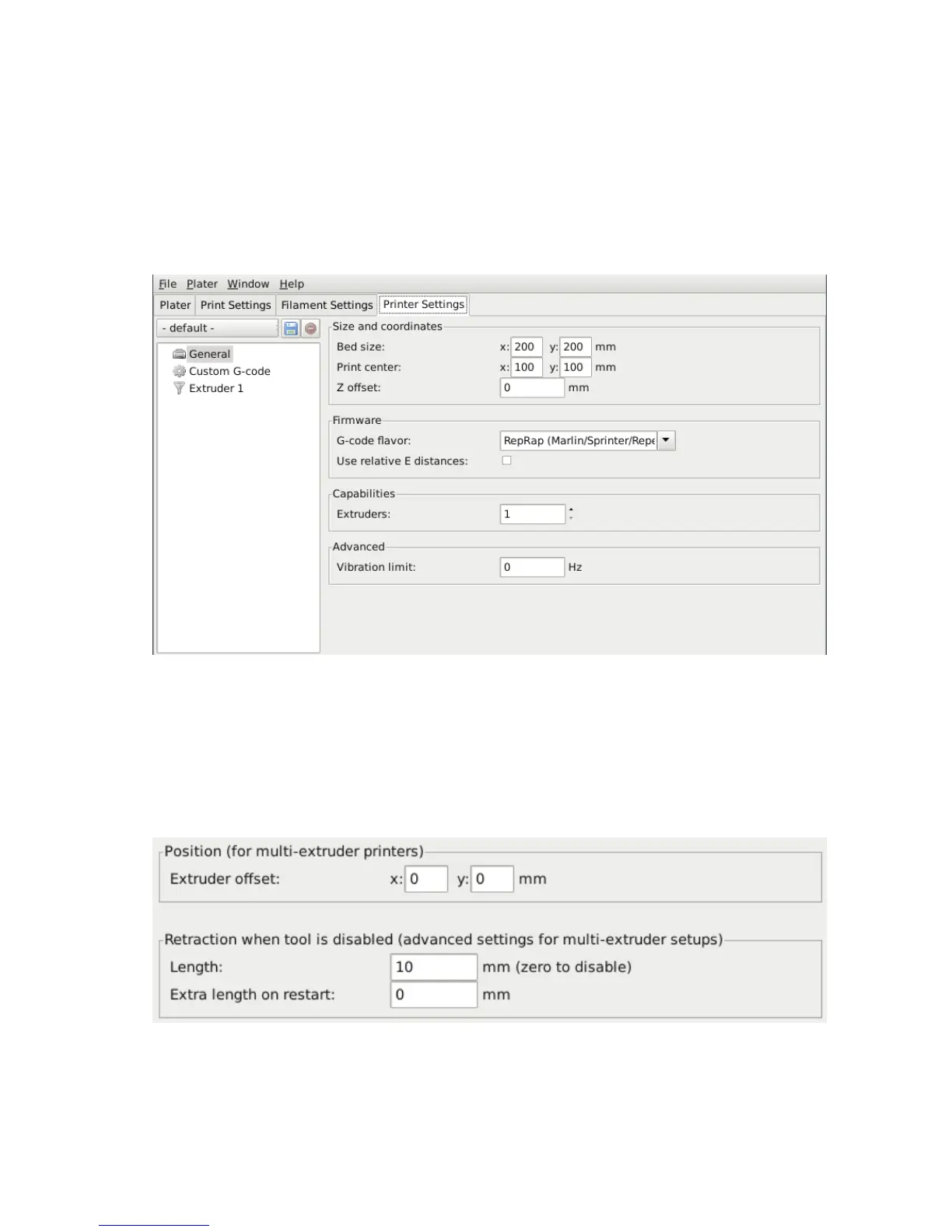 Figure 2.44: Multiple extruder options - Printer Settings Tab (Extruder).