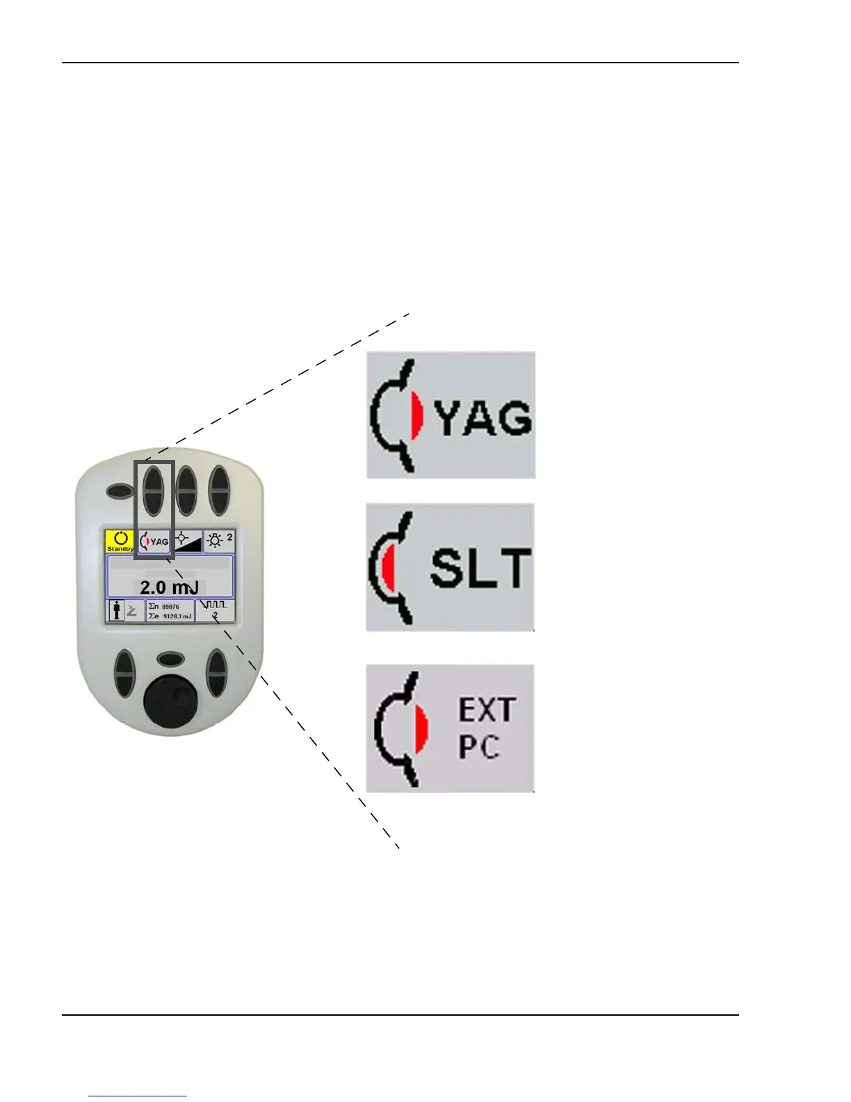 PC mode, laser standby/ready, aiming beam intensity, treatment settings, and
