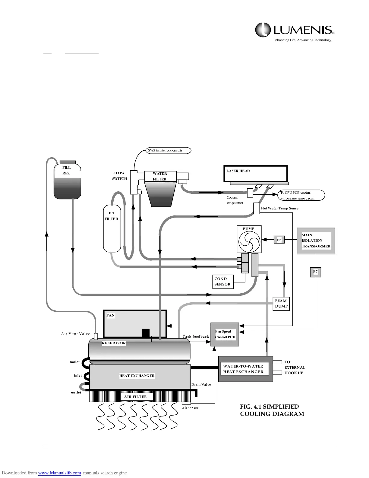 Refer to the Coolant System Simplified Diagram (Fig 4.1). As the lamps in the laser head are flashed, heat