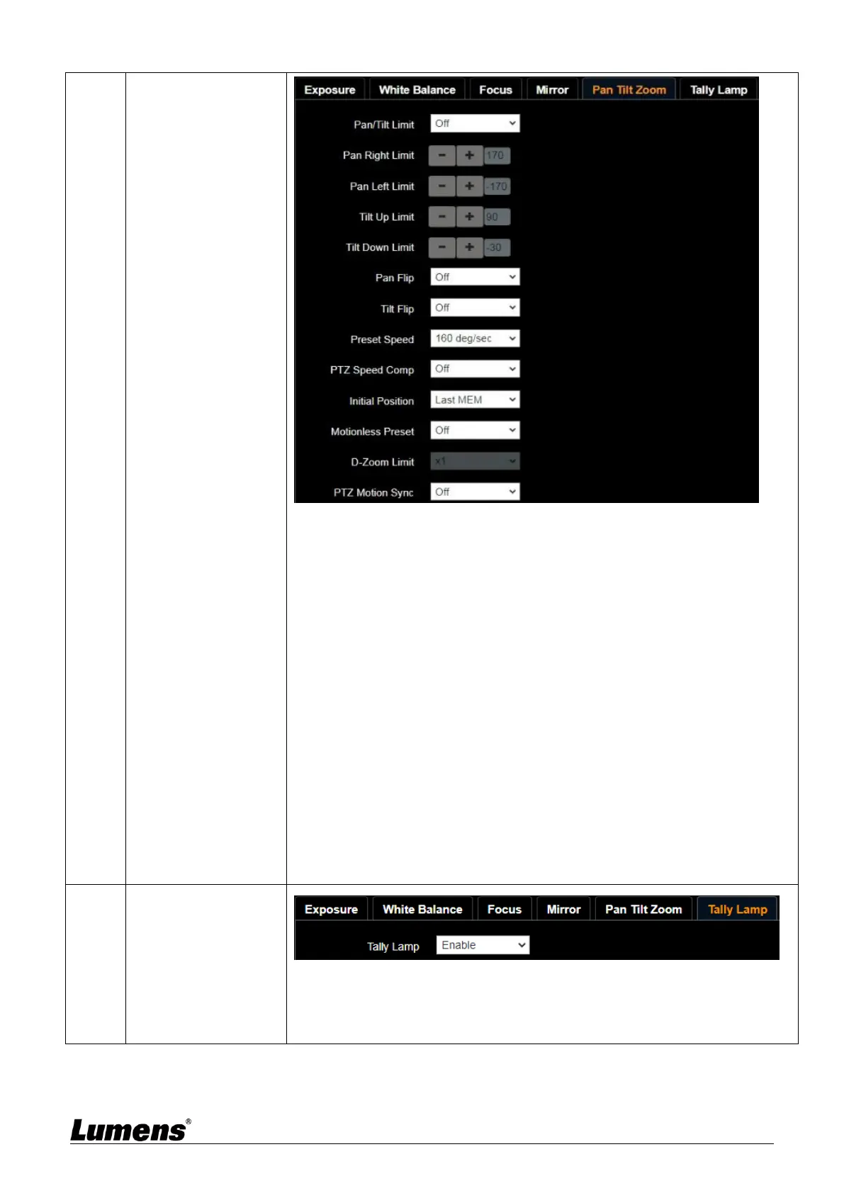 Pan/Tilt Limit: Set the Pan/Tilt limit