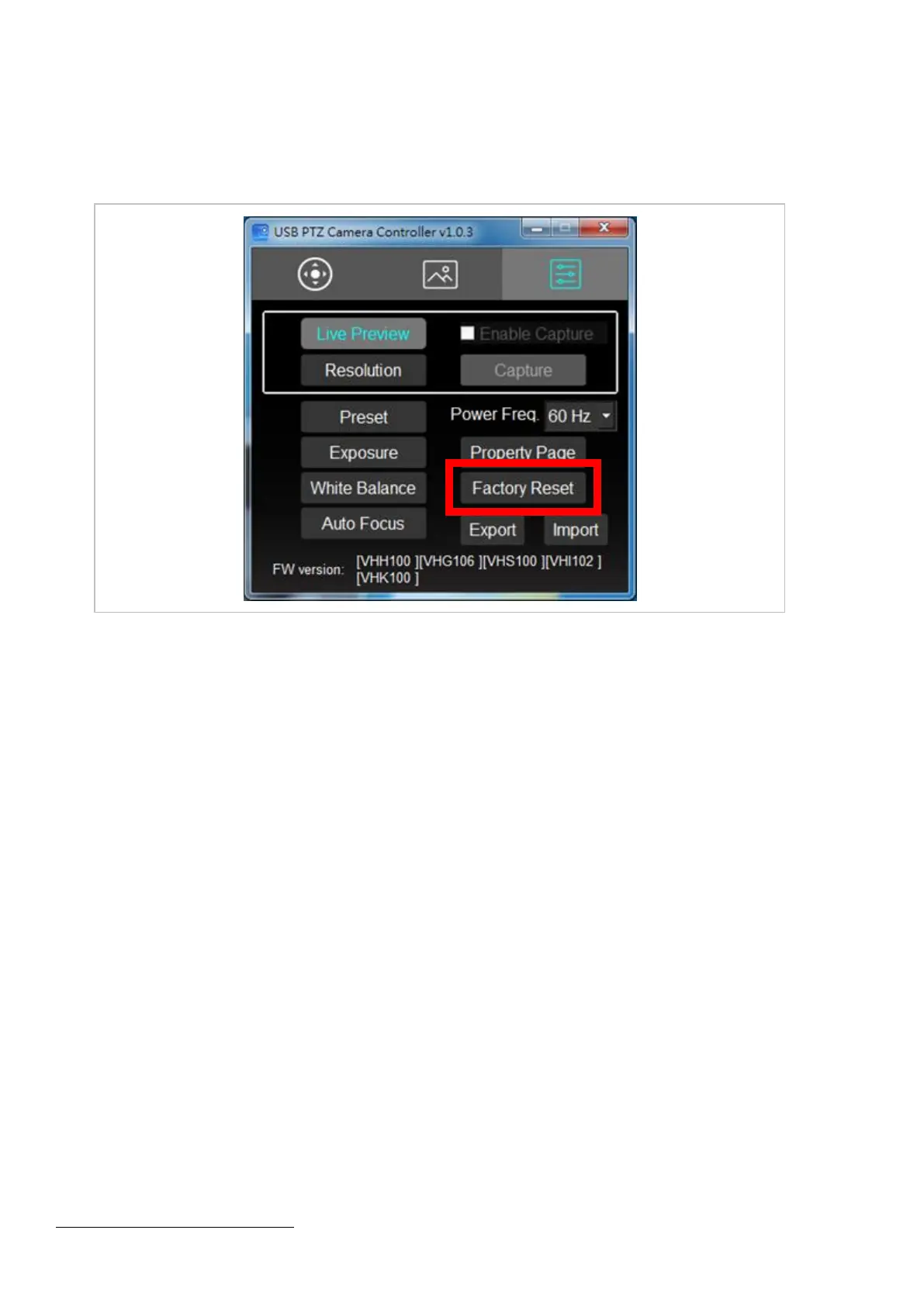3.7.2 From the software [USB PTZ Camera Controller]: [Advance] -->[Factory