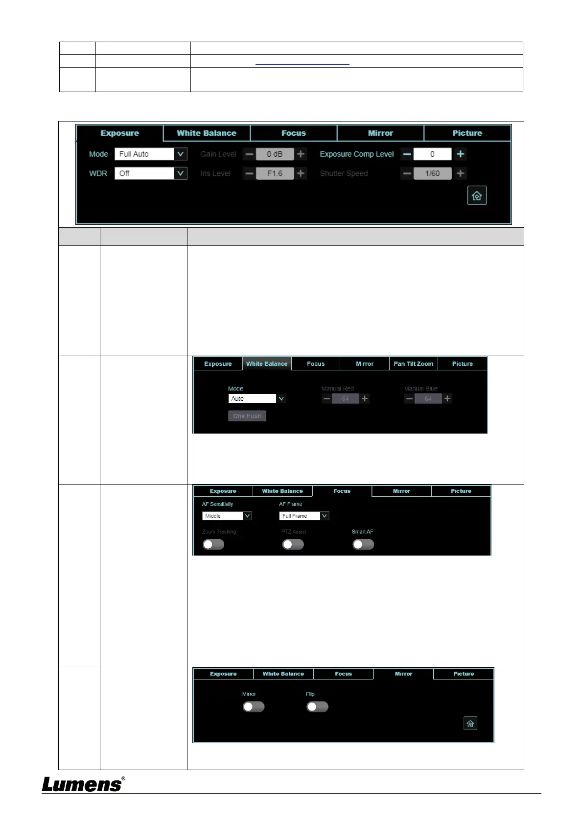 Iris Level: Adjust the size of aperture (adjustable only under the “Manual” or