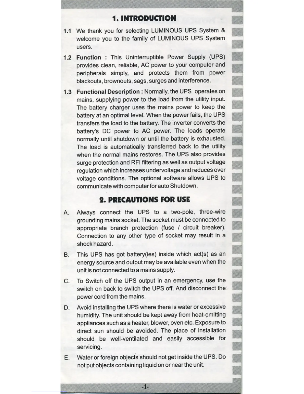 Luminous 600VA - INTRODUCTION; UPS Functionality and Description; PRECAUTIONS FOR USE; Safety and Installation Guidelines