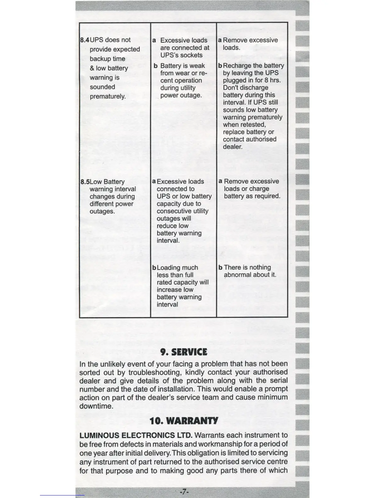 Luminous 600VA - TROUBLE SHOOTING (Continued); Backup Time and Warning Issues; SERVICE; Obtaining UPS Service Support