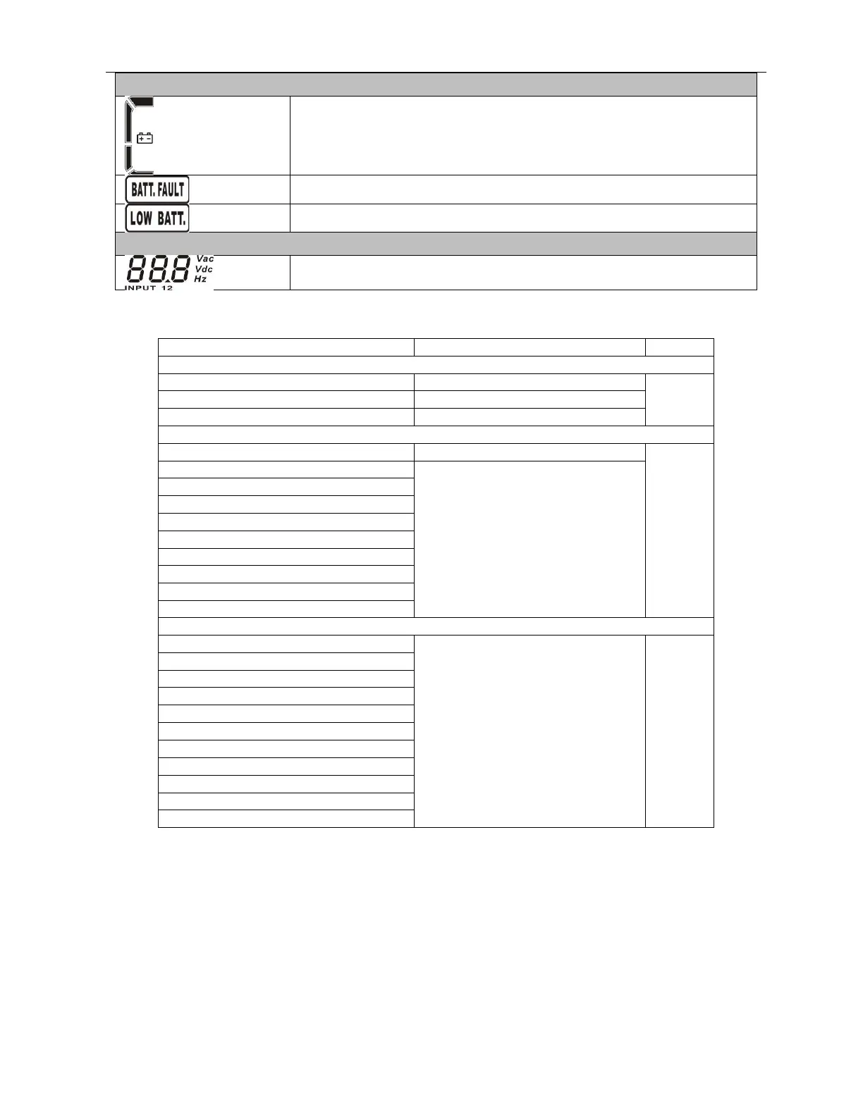 Vac: Input voltage, Vdc: battery voltage, Hz: input frequency