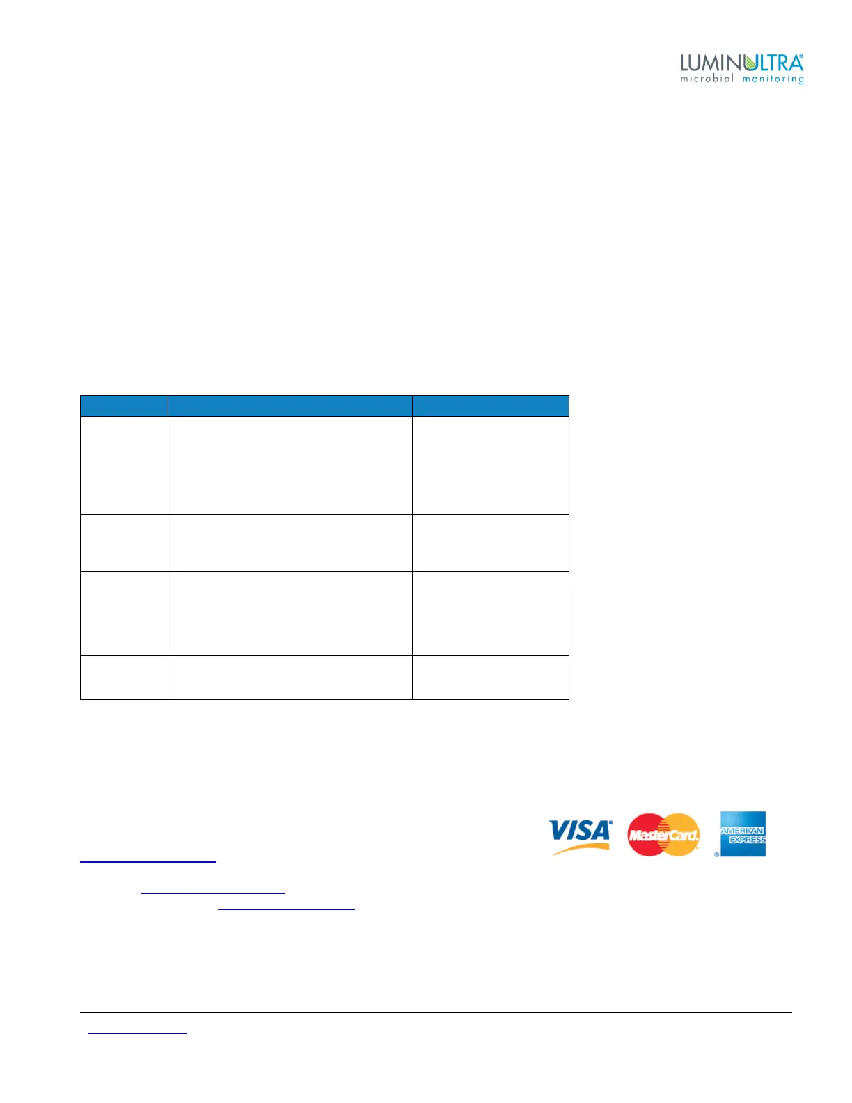 Major credit cards (Visa, MasterCard, AMEX) are accepted. Contact LuminUltra by phone to place credit card