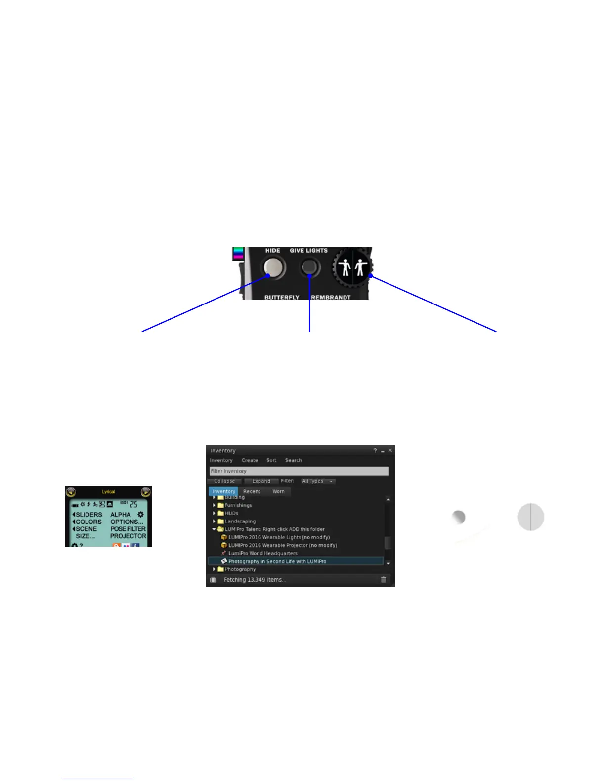 Directly under the LCD panel are four very important buttons: the Hide button, which instantly hides all wearables, rezzables, and the HUD itself; the Give Lights button, which sends a