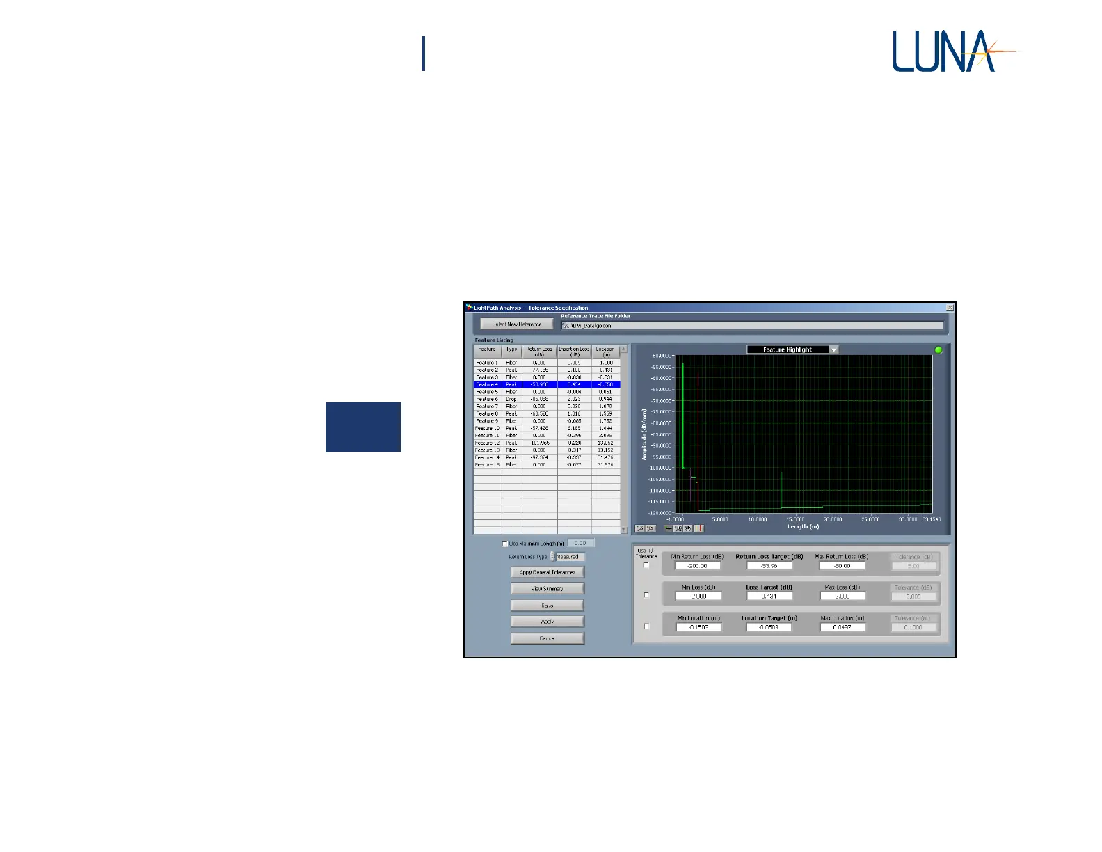 Trace. The Feature Listing grid shows the actual Return Loss, Loss (i.e. insertion