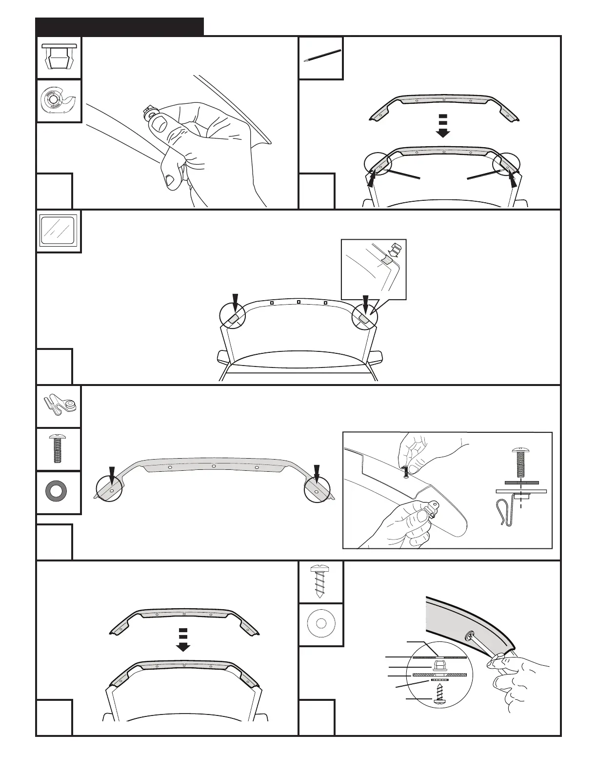 Instale los (2) soportes en los rebordes de la cubierta del capó EXTERIORES con tornillos para metales y arandelas negras.