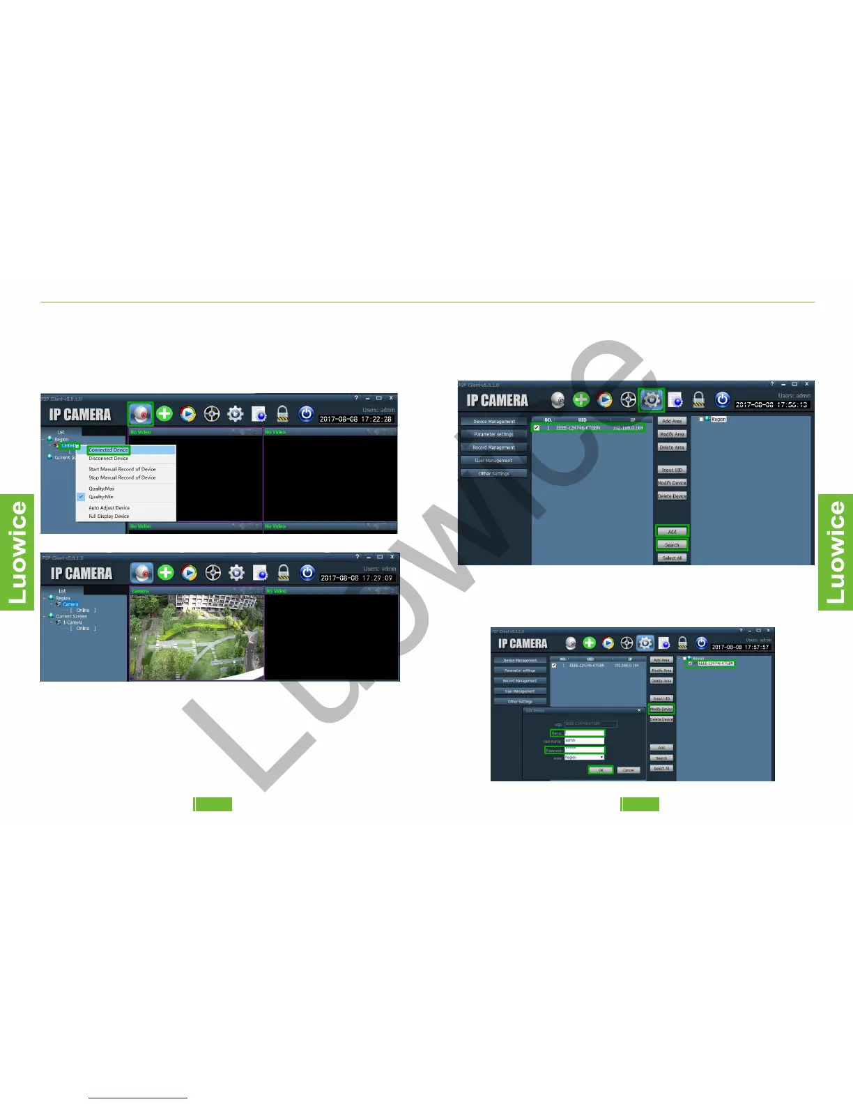 Device' icon. Input the name and password of the camera, and then click