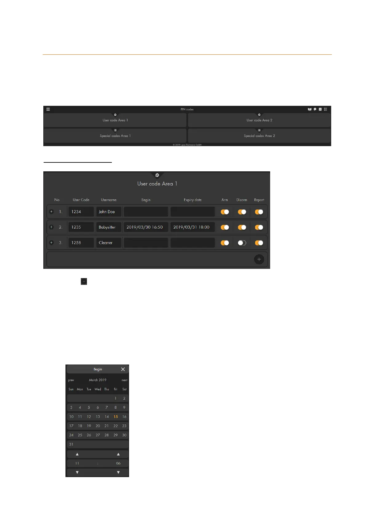 In this menu, you can define PIN codes and special codes for area 1 and area 2. You