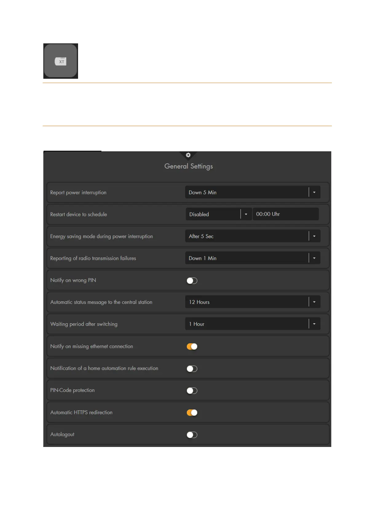 Comprises the sub-menus settings, siren settings, report, and PIN codes.