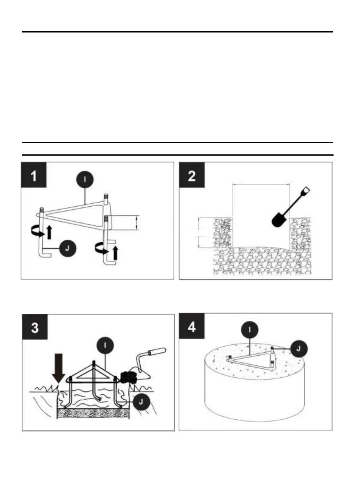 Fill the hole with concrete and insert the Concrete Mounting Bracket (I) and Anchor Bolts (J) before