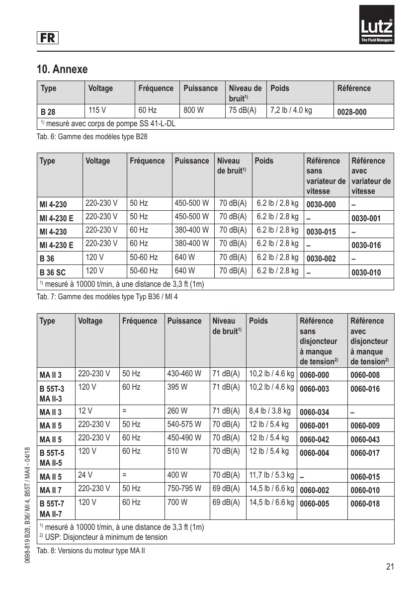 Tab. 7: Gamme des modèles type Typ B36 / MI 4