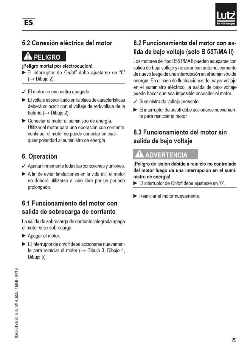 Lutz B28 - Conexión Eléctrica del Motor; 6 Operación; Funcionamiento del Motor con Salida de Sobrecarga de Corriente; Funcionamiento del Motor con Salida de Bajo Voltaje (solo B 55 T;MA II)
