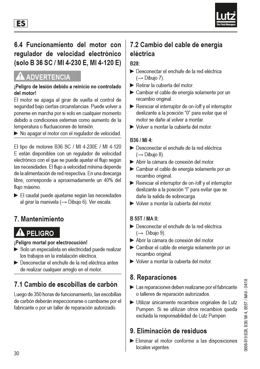 Lutz B28 - Funcionamiento del Motor con Regulador de Velocidad Electrónico (solo B 36 SC; MI 4-230 E, MI 4-120 E); 7 Mantenimiento y Reparación; Cambio de Escobillas de Carbón; Cambio del Cable de Energía Eléctrica