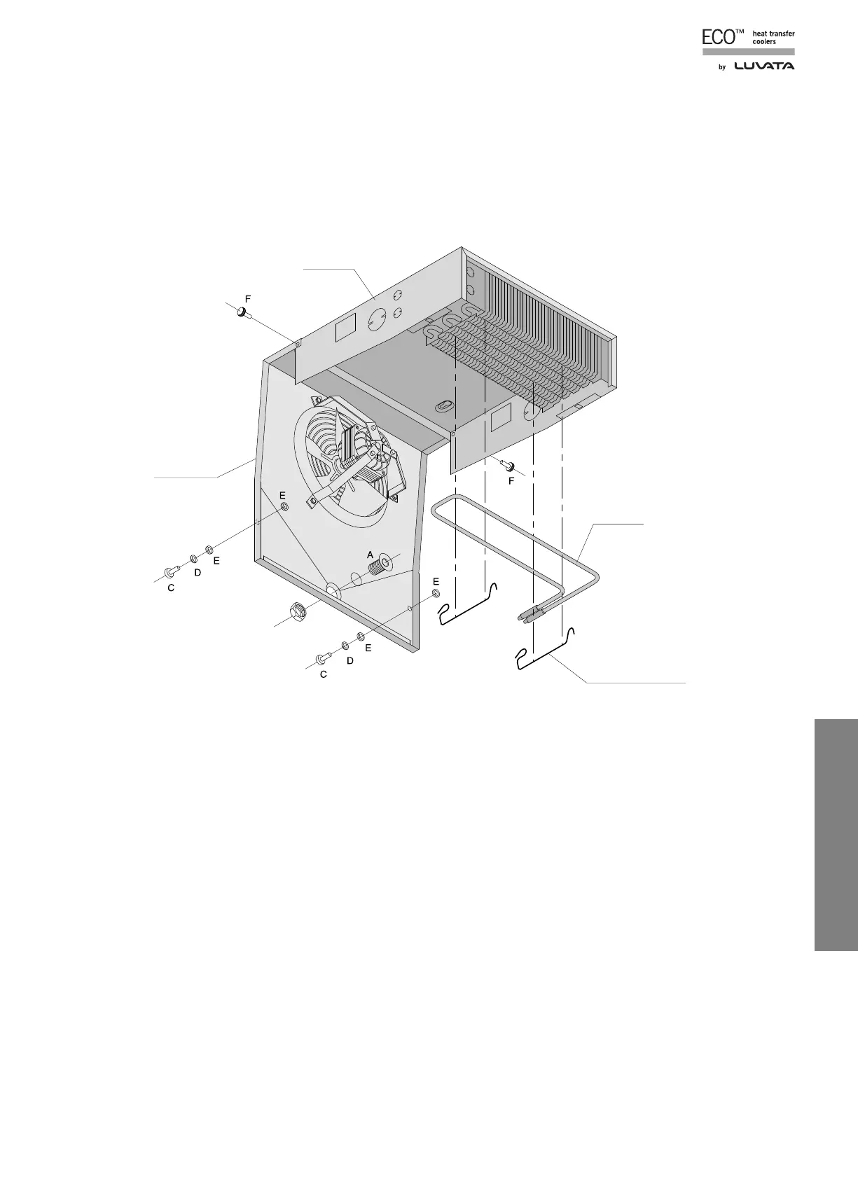 4. Utilizar el tornillo “C” la arandela “D” y la goma “E” como se indica en el dibujo, para cerrar y fijar el envolvente.