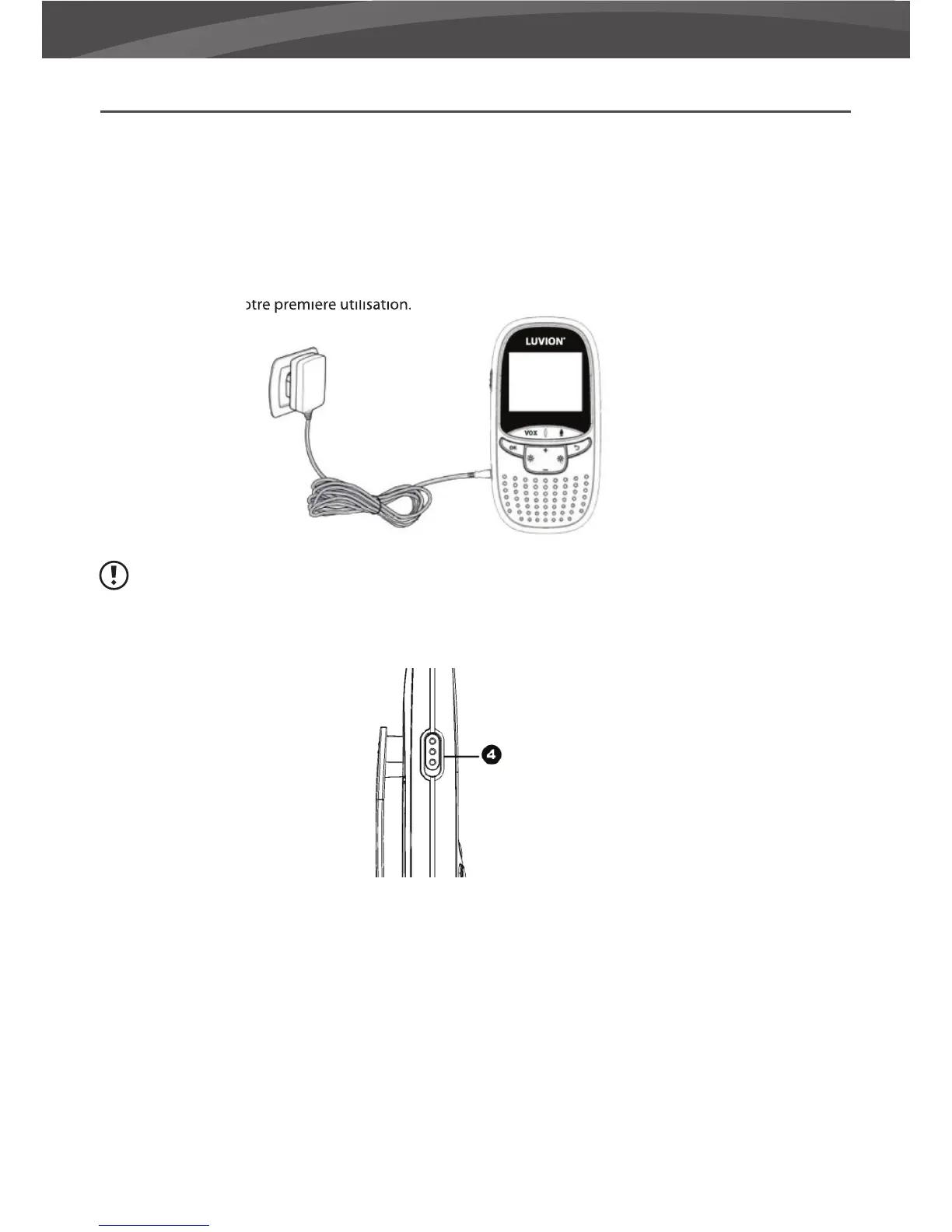 2. Connectez le moniteur à l’adaptateur secteur fourni a n de charger l’appareil parents. Si vous le