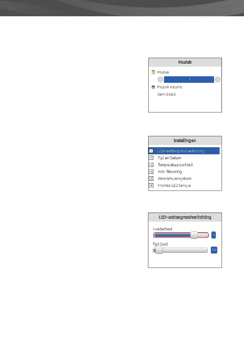 muziek instellen. Kies tussen laag, gemiddeld en hoog.