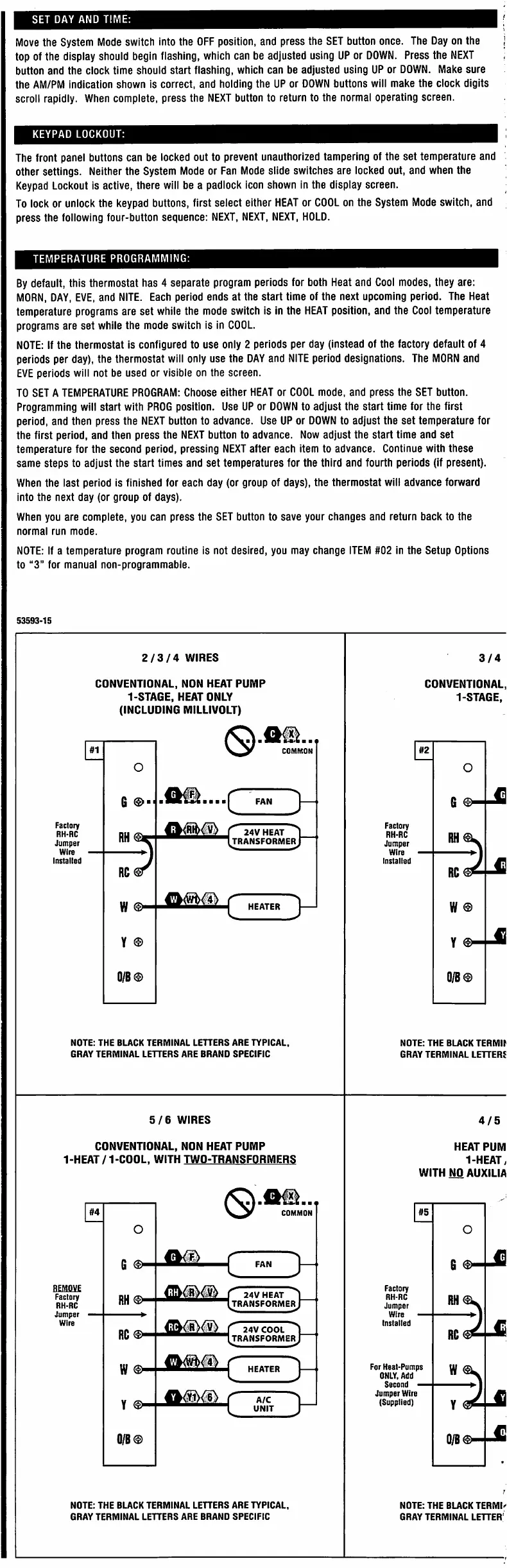 LUX TX100Ea - Basic Operations and Programming; Set Day and Time; Keypad Lockout Feature; Temperature Programming Guide