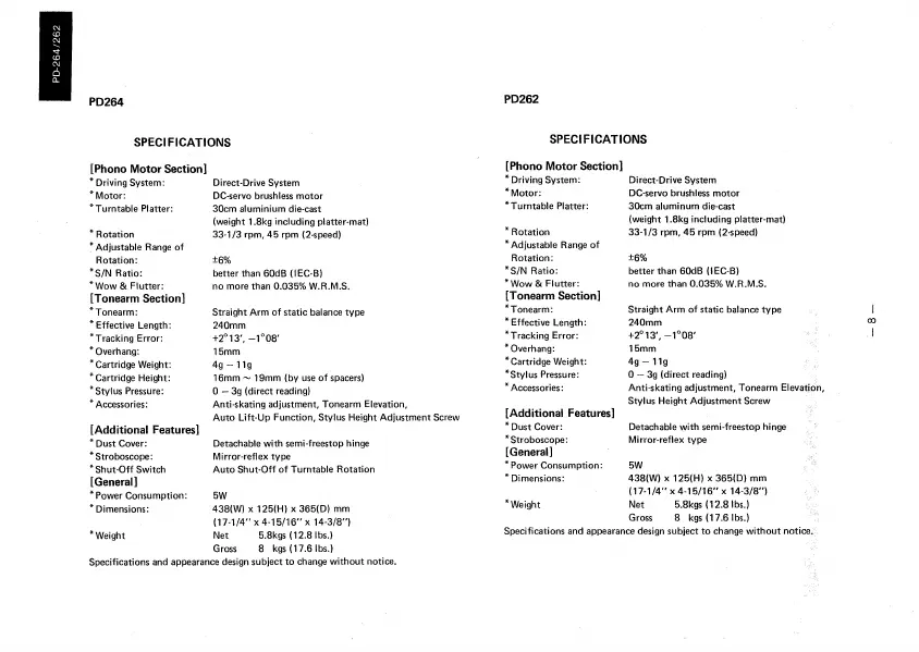 Luxman PD264 - Specifications; PD264 Specifications; PD262 Specifications