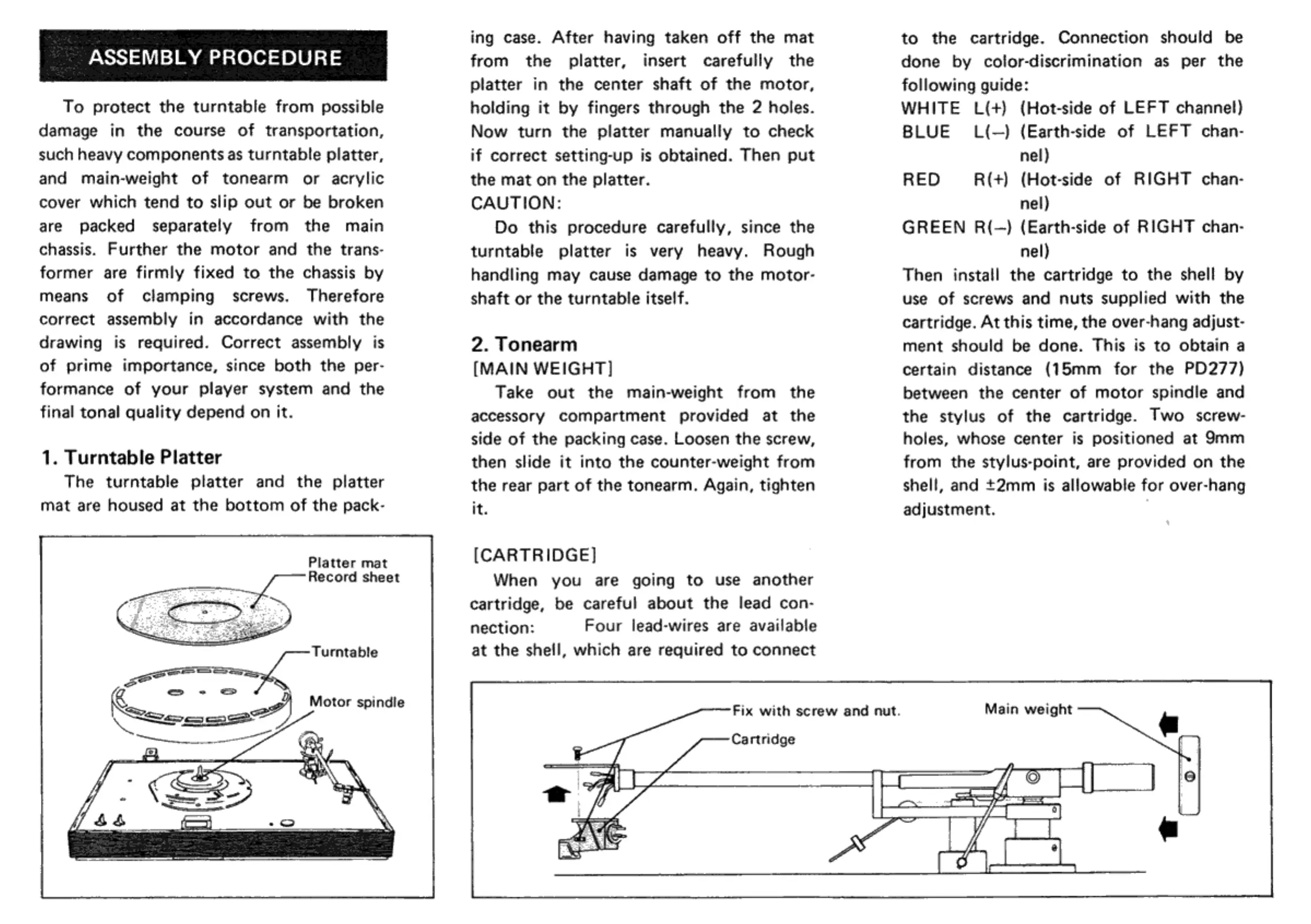 Luxman PD277 - ASSEMBLY PROCEDURE; Turntable Platter Assembly; Tonearm Main Weight Installation; Tonearm Cartridge Installation