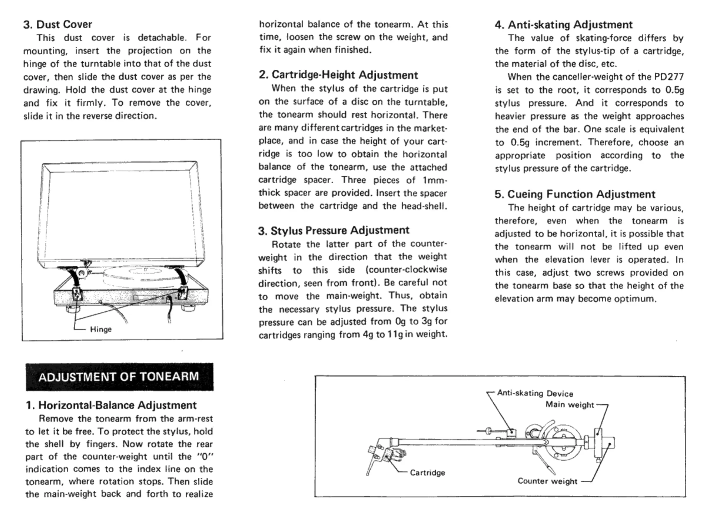 Luxman PD277 - ADJUSTMENT OF TONEARM; Tonearm Horizontal Balance Adjustment; Cartridge Height Adjustment; Stylus Pressure Adjustment