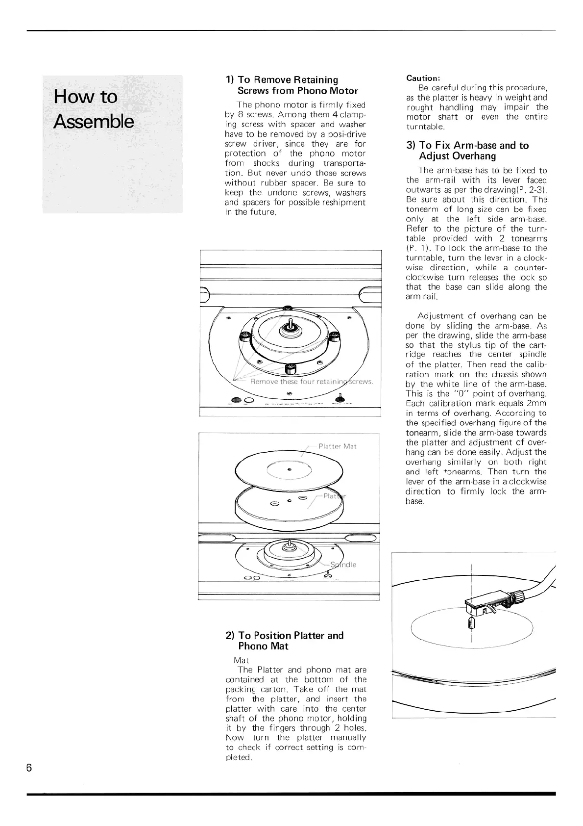 Luxman PD444 - How to Assemble the Turntable; Motor Retaining Screws; Platter and Mat Placement; Arm-base and Overhang Adjustment