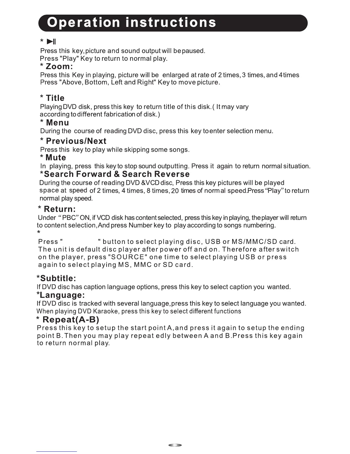 Luxor DIGITAL DVD PLAYER - Operation Instructions; Playback Control Functions; Disc Source Selection; Subtitle and Language Options