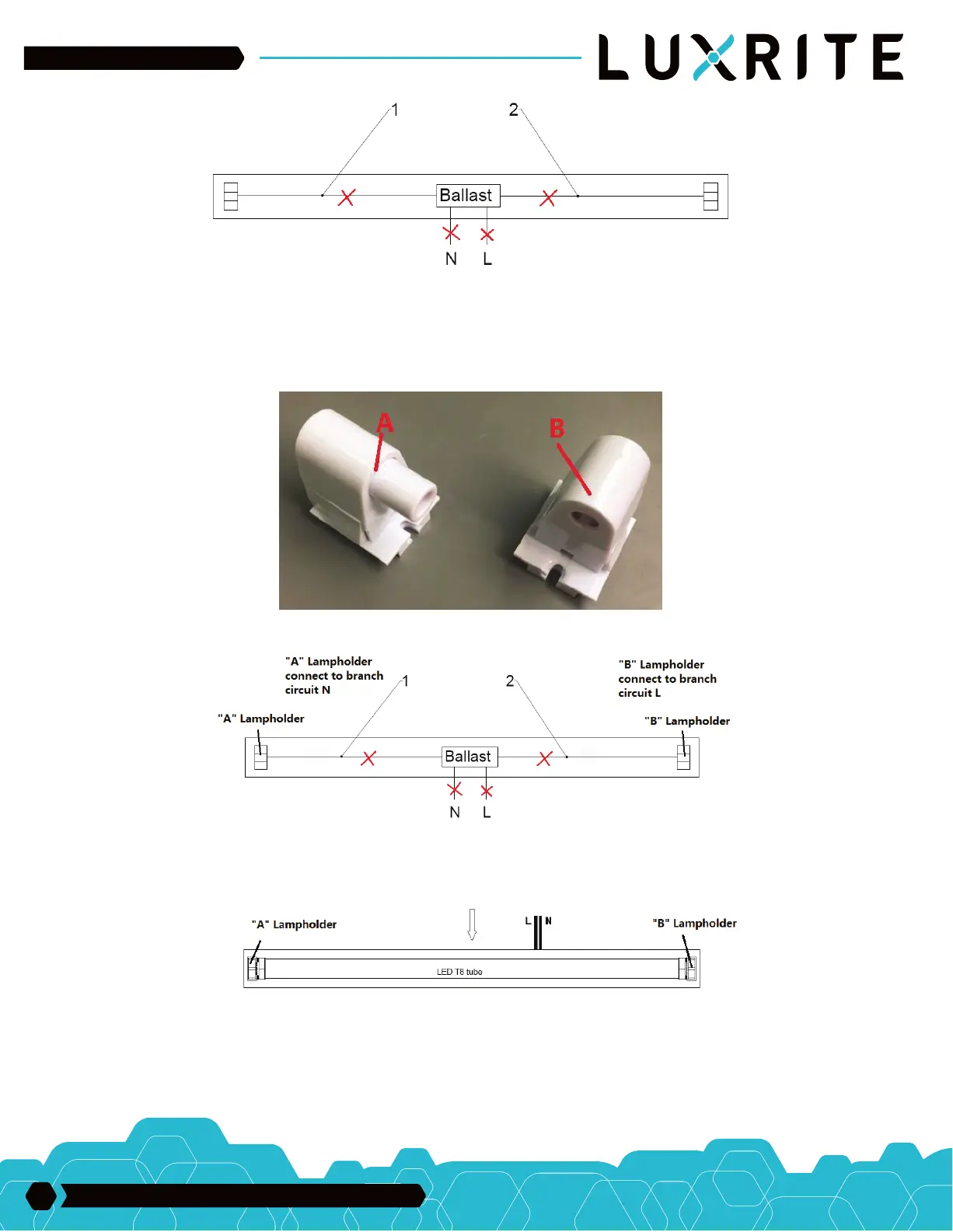 STEP 7. The attached “A: and ”B” lampholders as shown in Figure 4, with “A” lampholder connecting grounded (neutral) branch circuit “N”