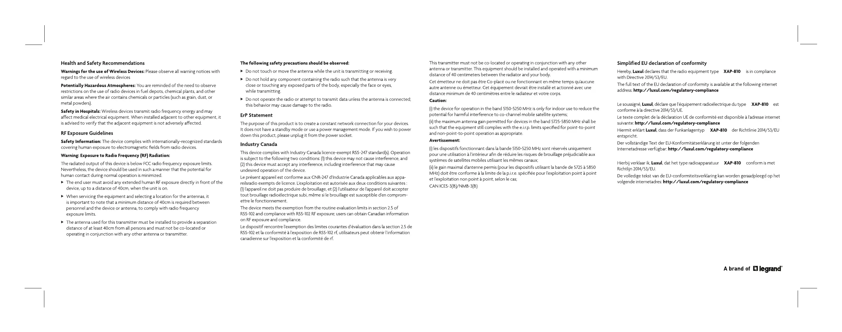 Luxul XAP-810 - Health and Safety Recommendations; Warnings for Wireless Devices; RF Exposure Guidelines; Warning: RF Radiation Exposure