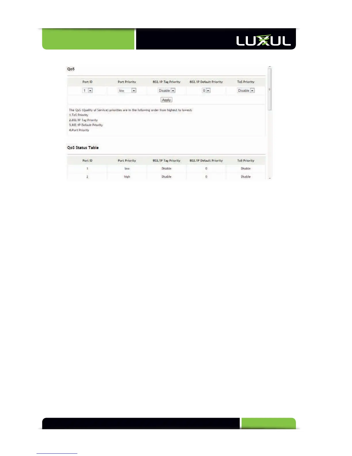 ToS Priority: If “ToS Priority” is enabled, the switch automatically reads an 8-bit