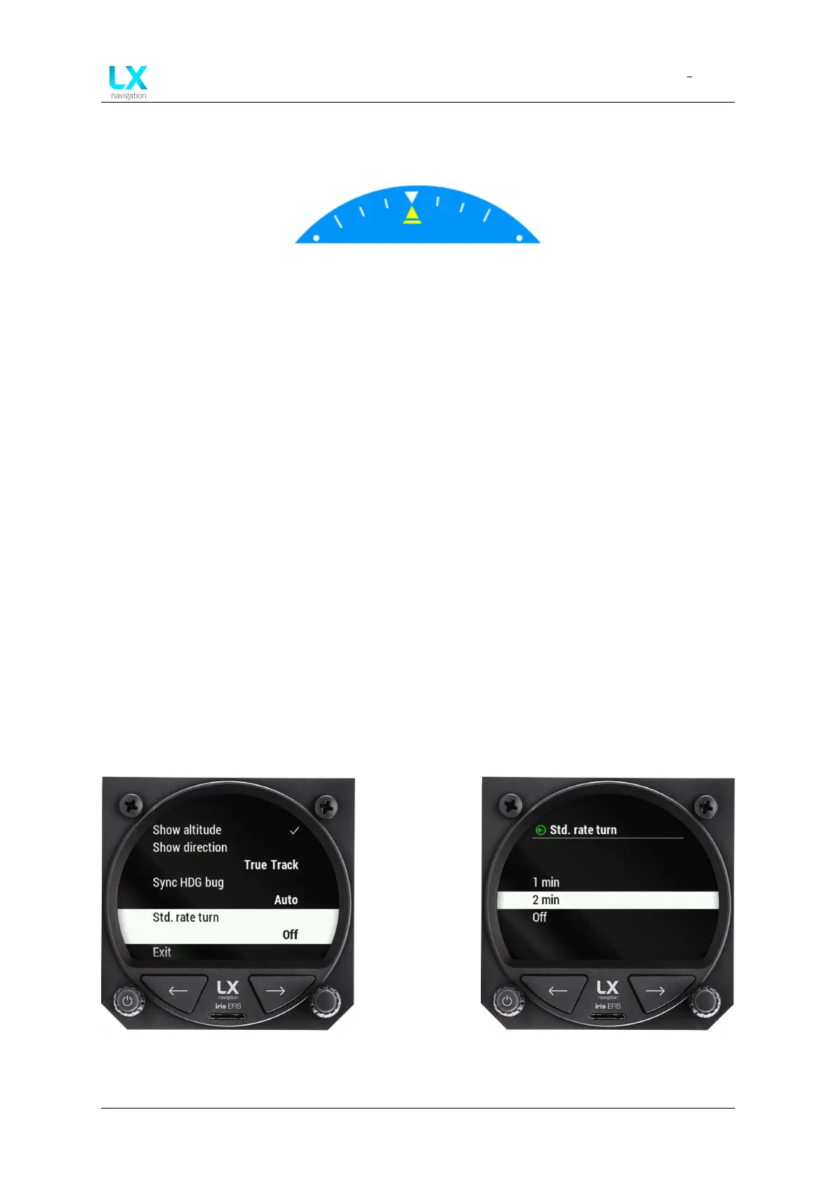 the ”Std. rate turn” menu. Scroll and press in to select from the list.