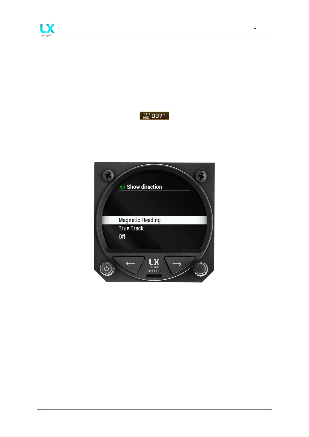 to ”Show direction” and press to select. Pilot can select between ”Magnetic heading”, ”True